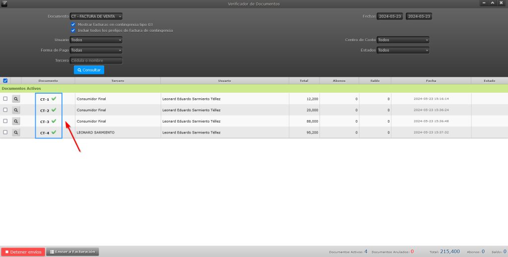 - El sistema buscará entre las facturas de contingencia emitidas por el prefijo CT (y los demás prefijos en caso de que se haya activado la casilla Incluir todos los prefijos de factura de contingencia) que tengan pendiente el proceso de transmisión a la DIAN. En caso de que ya se hayan transmitido, no se mostrará ningún resultado.