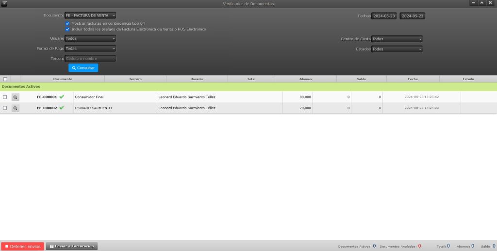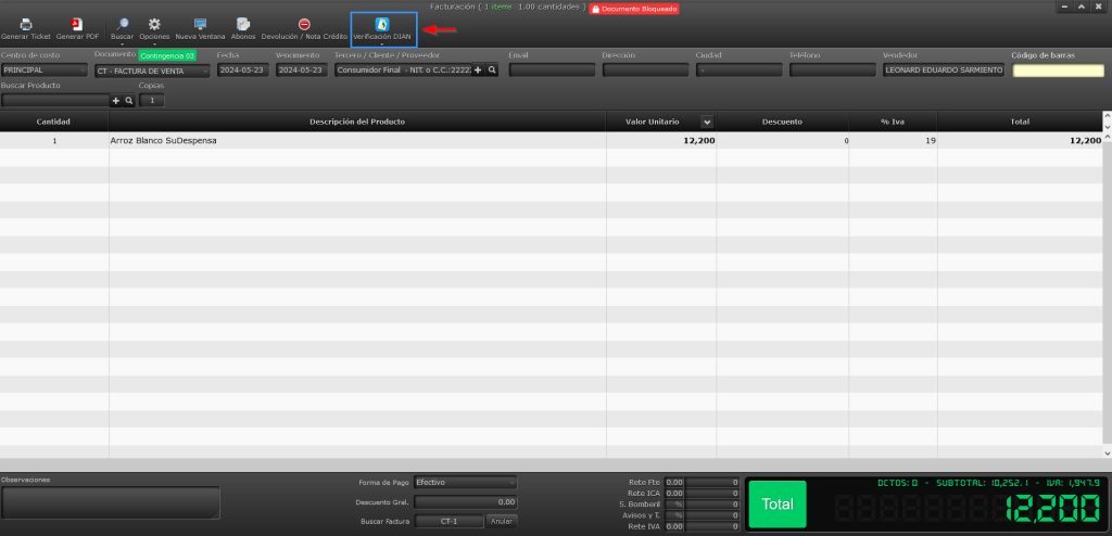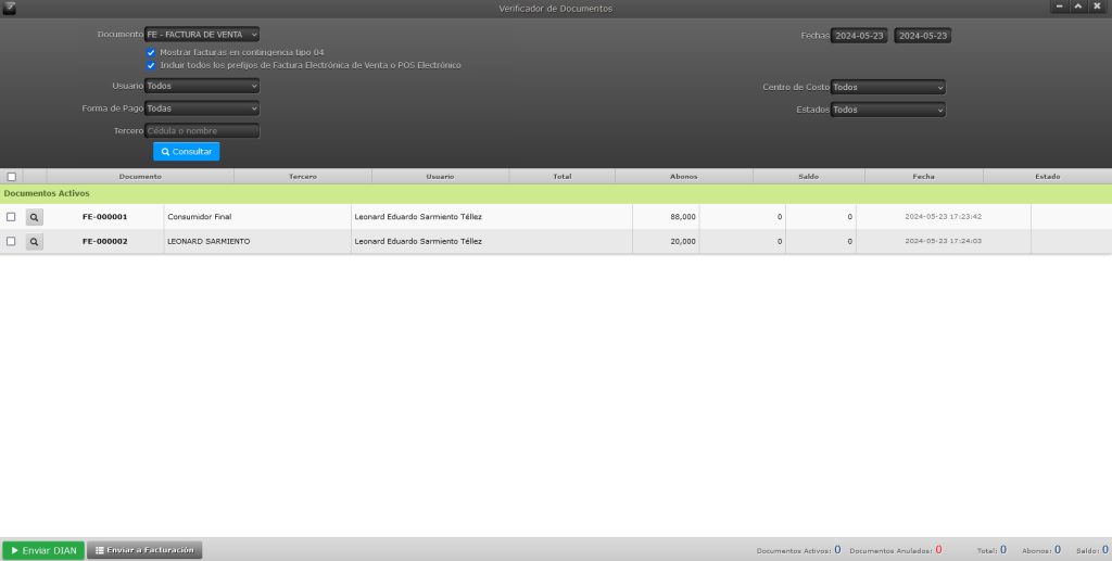 Con este paso se habrán transmitido correctamente a la DIAN las Facturas Electrónicas de Ventao Documentos Equivalentes Electrónicos de Máquina Registradora con Sistema POSque se hayan generado sin validación previa. Se podrá validar listando en Facturación alguna de las facturas de contingencia y dando clic en el botón Verificación DIAN.