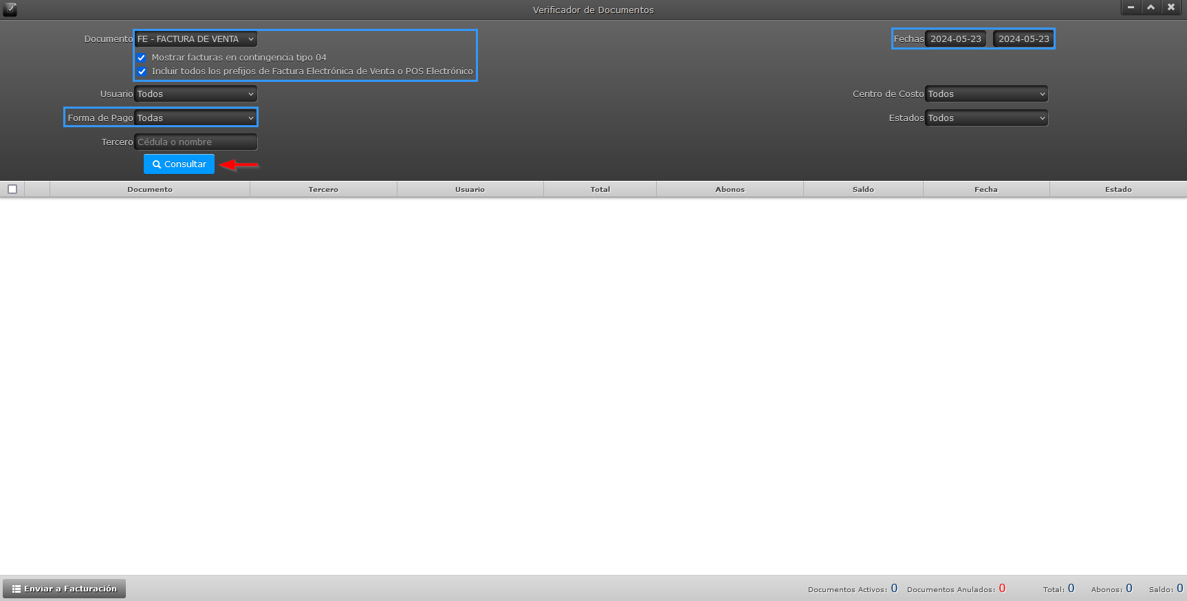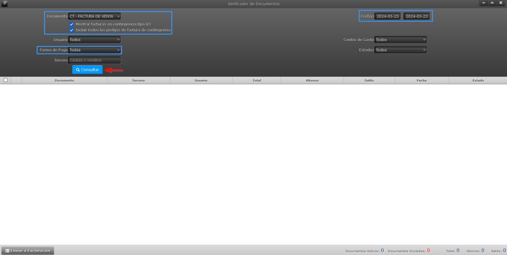 - Validar que en la casilla Forma de Pago este seleccionado el valor Todas con el fin de que se muestren todas las facturas de contingencia sin importar la forma de pago.