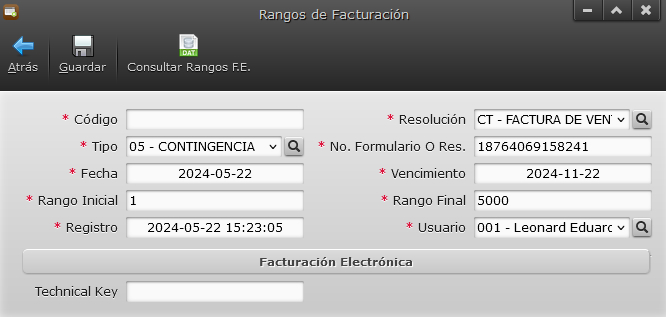 - Crear la autorización de facturación de contingencia Talonario o de Papel en ITS haciendo uso del formulario Rangos de Facturación, como se detalla en el MANUAL RANGOS DE FACTURACIÓN.