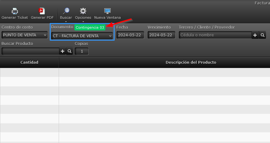 Nótese que al escoger el documento de Talonario o de Papel destinado para contingencia tipo 03 en la pantalla de Facturación, se mostrará la etiqueta Contingencia 03 en color verde.