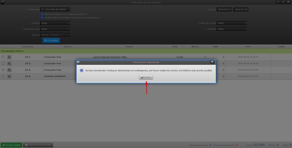 - Se da clic en Aceptar. Se procede a seleccionar los documentos a transmitir, ya sea seleccionando algunos o todos a la vez. Luego se procede a transmitir dando clic en el botón Enviar Dian y se confirma la acción dando clic en Aceptar.