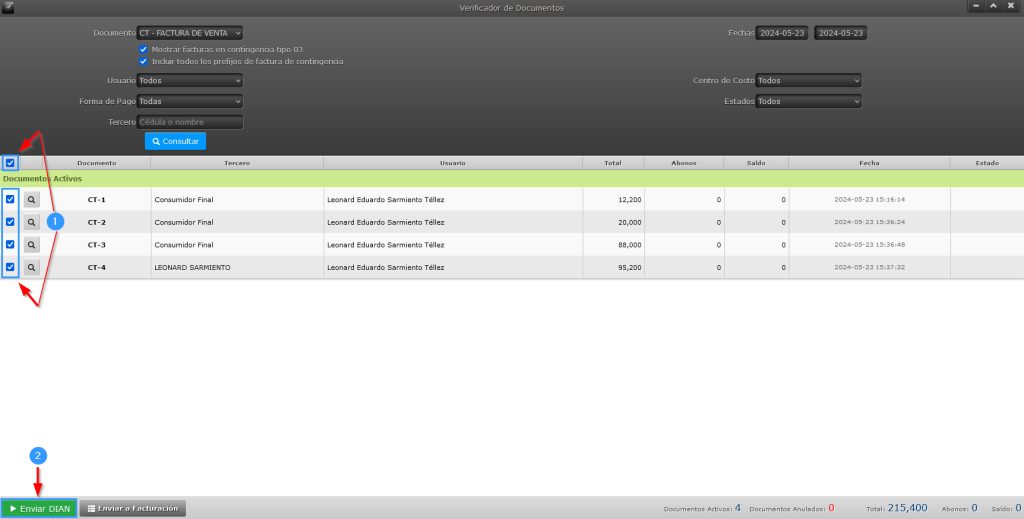 - Se seleccionan los documentos a transmitir y se da clic en Enviar DIAN de la misma forma como se explicó en la contingencia tipo 03.